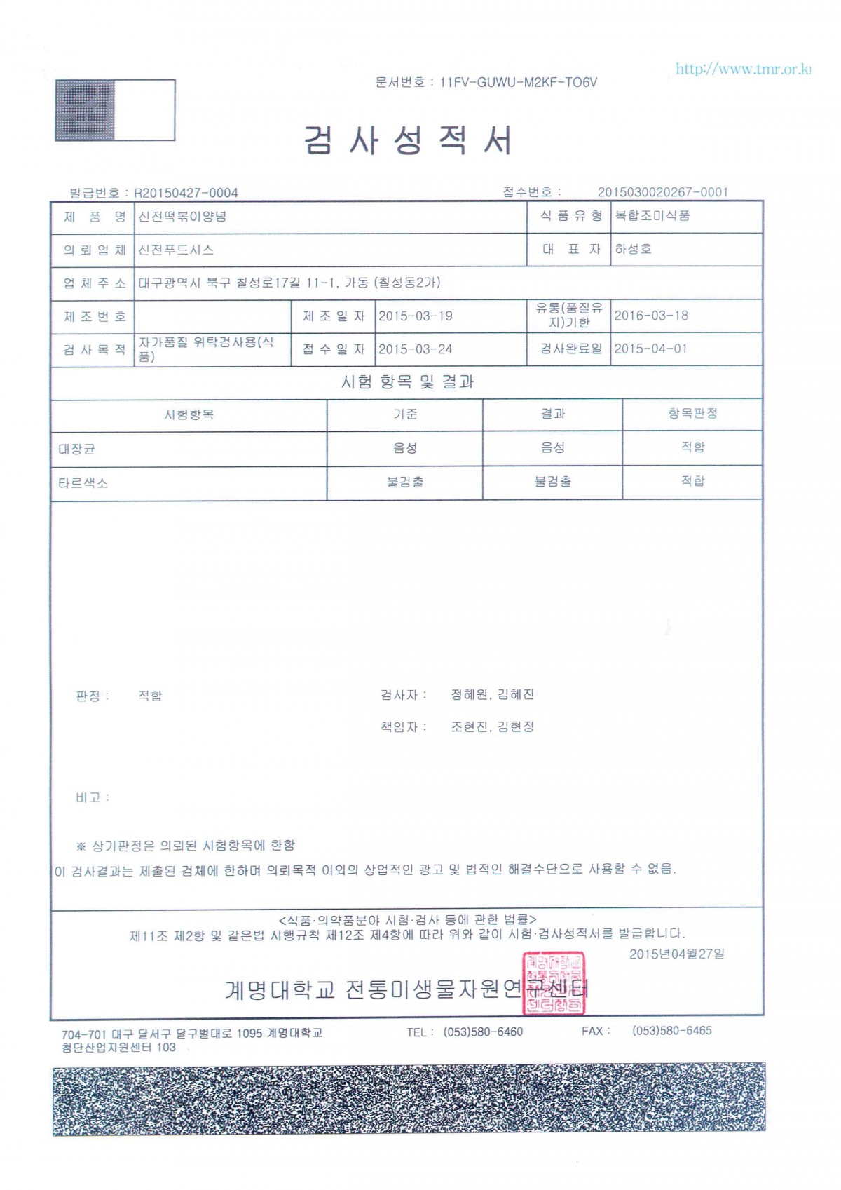 2015 | 2015 - 03 검사성적서 페이지 정보 작성자 신전떡볶이 작성일15-04-28 13:48 조회4,376회 댓글0건 관련링크 이전글 다음글 검색 목록 본문 2015 - 03 검사성적서 이전글 다음글 검색 목록