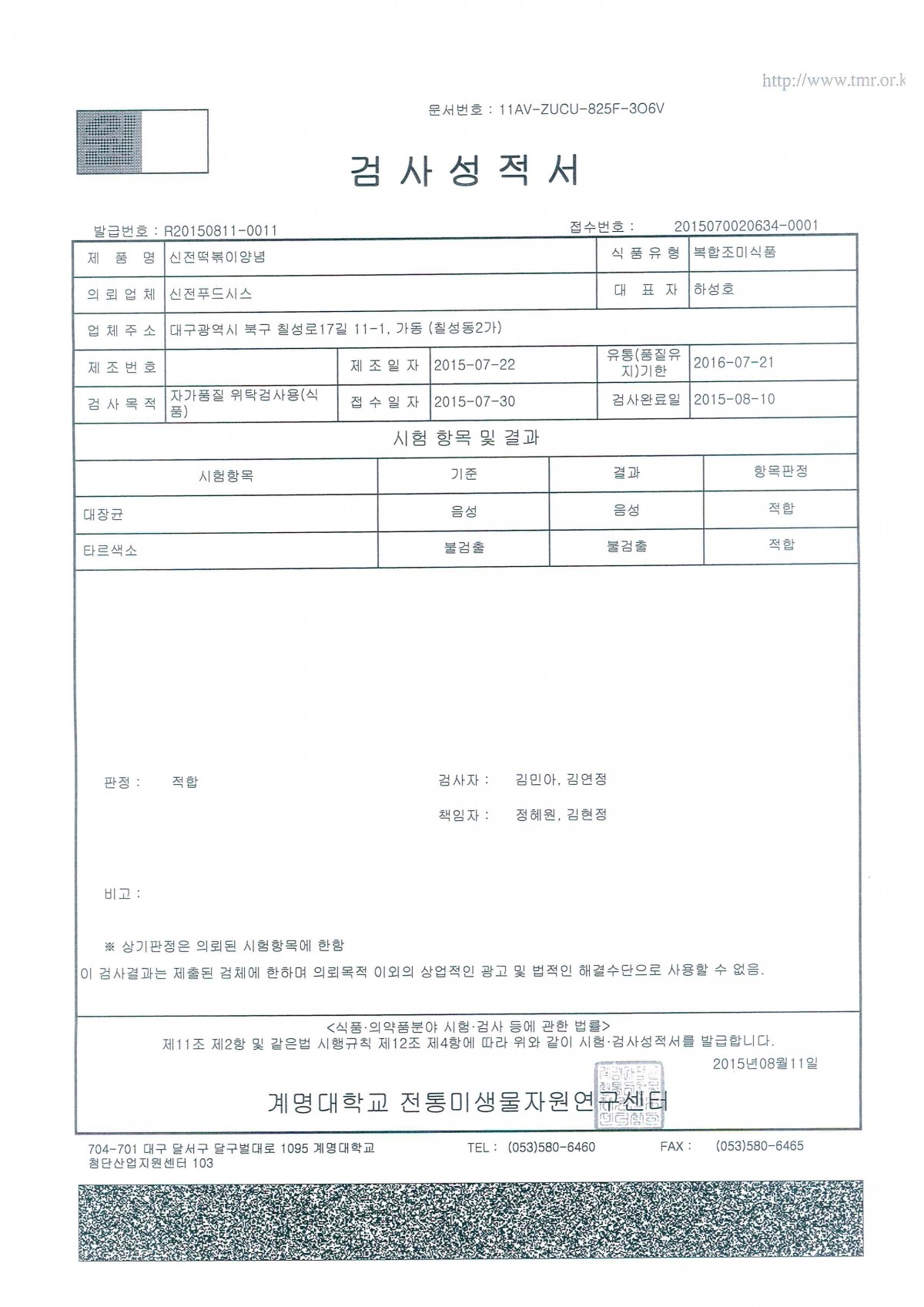2015 | 2015 -07 검사성적서 페이지 정보 작성자 신전떡볶이 작성일15-08-12 15:12 조회3,920회 댓글0건 관련링크 이전글 다음글 검색 목록 본문 검사성적서 이전글 다음글 검색 목록
