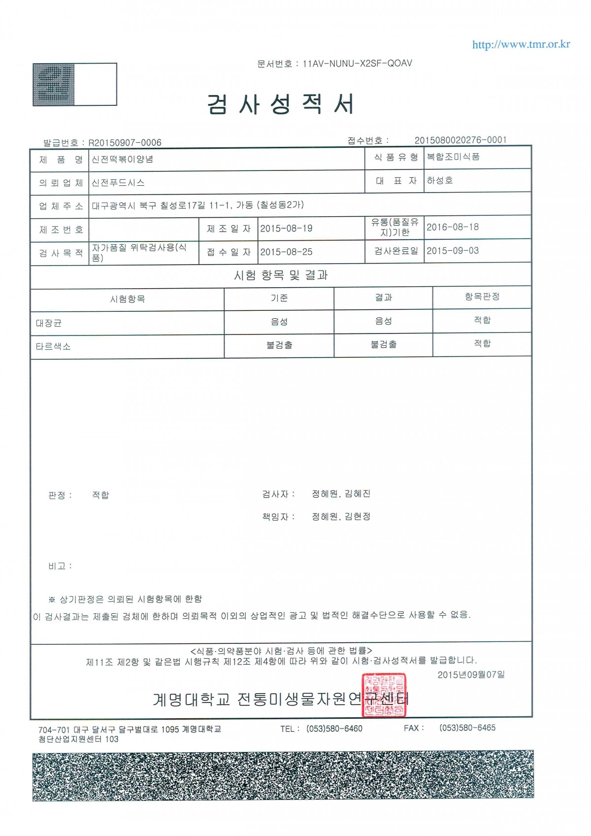 2015 | 2015 -08 검사성적서 페이지 정보 작성자 신전떡볶이 작성일15-09-08 13:00 조회4,089회 댓글0건 관련링크 이전글 다음글 검색 목록 본문 2015년 8월 신전양념 검사성적서입니다. 이전글 다음글 검색 목록