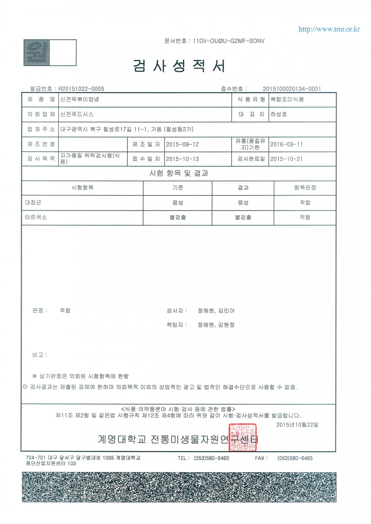 2015 | 2015 -09 검사성적서 페이지 정보 작성자 신전떡볶이 작성일15-10-23 14:42 조회3,578회 댓글0건 관련링크 이전글 다음글 검색 목록 본문 2015년 9월 신전양념 검사성적서입니다. 이전글 다음글 검색 목록