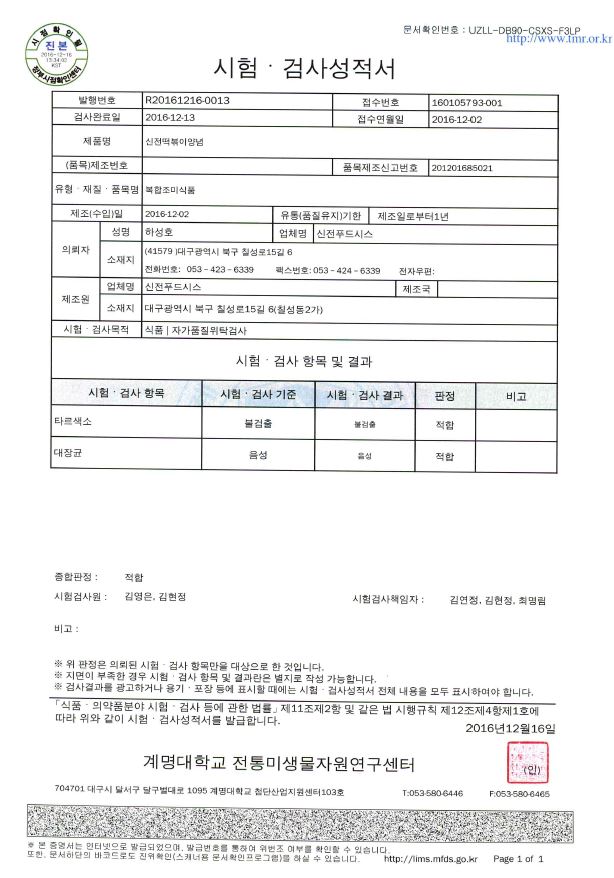 2016 | 2016-12 검사성적서 페이지 정보 작성자 신전떡볶이 작성일17-01-05 09:20 조회1,790회 댓글0건 관련링크 다음글 검색 목록 본문 2016-12 검사성적서 다음글 검색 목록