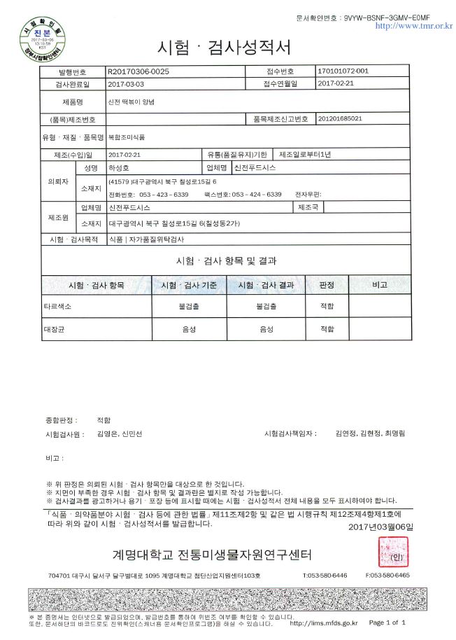 2017 | 2017-03 검사성적서 페이지 정보 작성자 신전떡볶이 작성일17-04-06 09:39 조회1,429회 댓글0건 관련링크 이전글 다음글 검색 목록 본문 2017-03 검사성적서 이전글 다음글 검색 목록