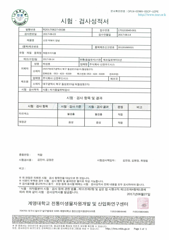 2017 | 2017-06 검사성적서 페이지 정보 작성자 신전떡볶이 작성일17-07-05 13:37 조회1,460회 댓글0건 관련링크 이전글 다음글 검색 목록 본문 2017-06 검사성적서 이전글 다음글 검색 목록